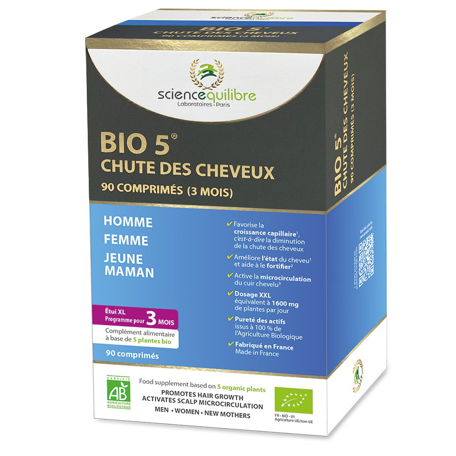 Depuis plus de 10 ans, les comprimés BIO 5 chute des cheveux proposent une solution 100% bio pour :